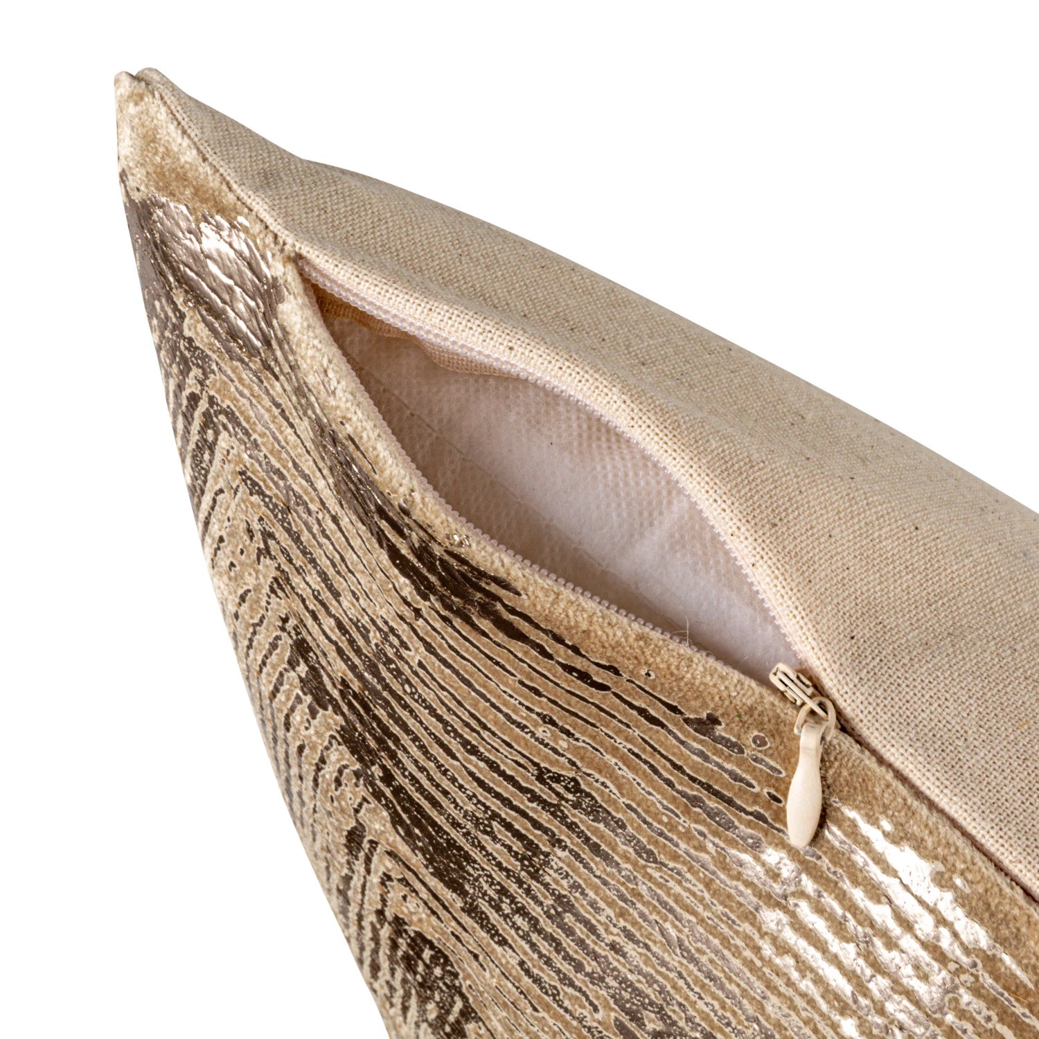This Aureate Sands Velvet Lumbar Pillow exudes a quiet elegance with its creamy sand hue and shimmering gold foil pattern. The luxurious blend of viscose and cotton velvet offers a smooth, indulgent touch, while the polyester filling provides a comforting, resilient cushion. Measuring 20 inches long and 14 inches high, this pillow is ideally sized for adding an accent of refined glamour to any seating arrangement. Whether it's offering support on a sleek modern sofa or adding a touch of splendor to a well-dressed bed, this pillow is a versatile and chic choice for any design-conscious homeowner. Its understated design radiates sophistication, making it a timeless addition to the home décor.
