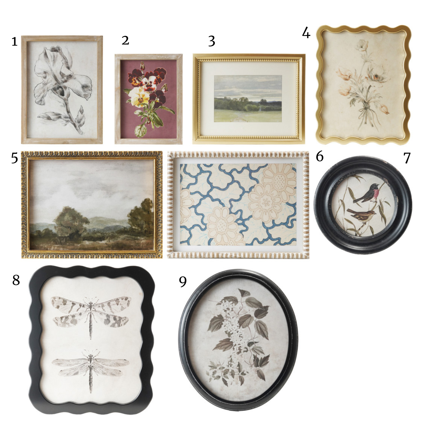 Wood Framed Glass Wall Decor w/ Landscapes, Botanicals & Insect Prints