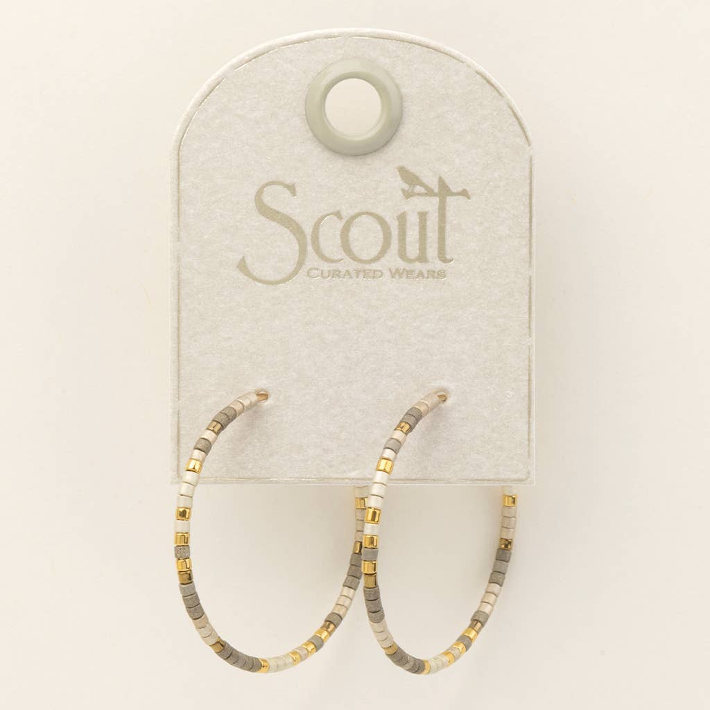 Crafted with precision-cut Miyuki Delica beads, these small hoops deliver sophisticated color play in a refined pewter and gold palette. The 1.25" diameter strikes an elegant balance—substantial enough to make a statement, delicate enough for everyday wear. Choose between 14K gold or sterling silver-dipped brass construction, both nickel and cadmium-free for sensitive skin. Layer with complementary pieces or wear solo for understated luxury. Presented on a premium card with gold foil detailing, these hypoallergenic earrings are ready to gift or treasure.