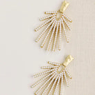 Elevate your seasonal wardrobe with these striking sunburst drop earrings, where hammered gold meets crisp white for understated elegance. The 2-inch length and post-back closure offer comfortable, all-day wear, while the geometric design serves as a refined accent to vibrant spring and summer palettes. A versatile statement piece that bridges bold and timeless.