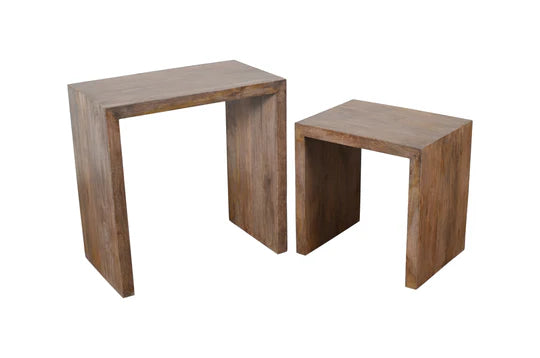 Dexter Nesting Tables bring versatile storage and display to any room. This two-piece set features a smaller table (24"W x 17"D x 24"H) that nests seamlessly under the larger table (31.5"W x 17"D x 31"H), making it perfect for flexible living spaces. Crafted from warm mango wood, these tables offer natural beauty and durability. Use them together for extra surface space or separate them throughout your home for added functionality and style.